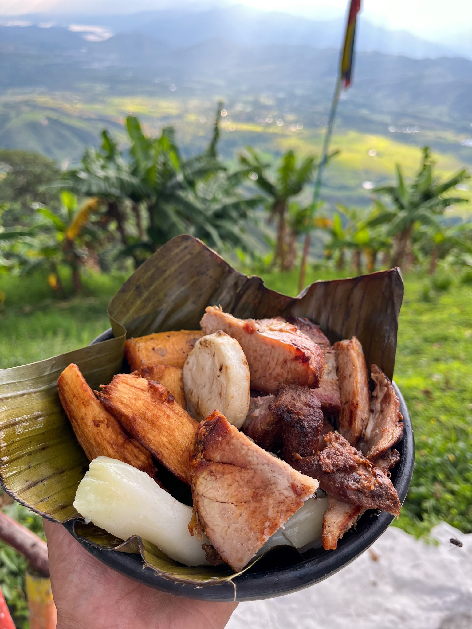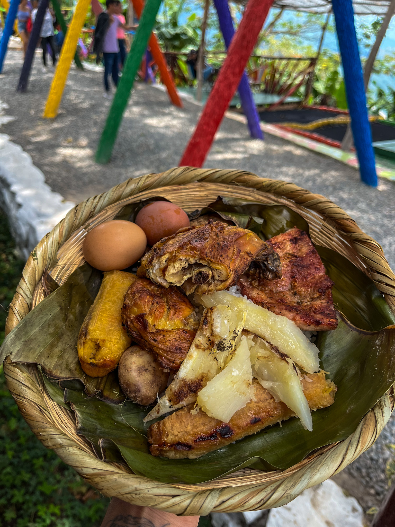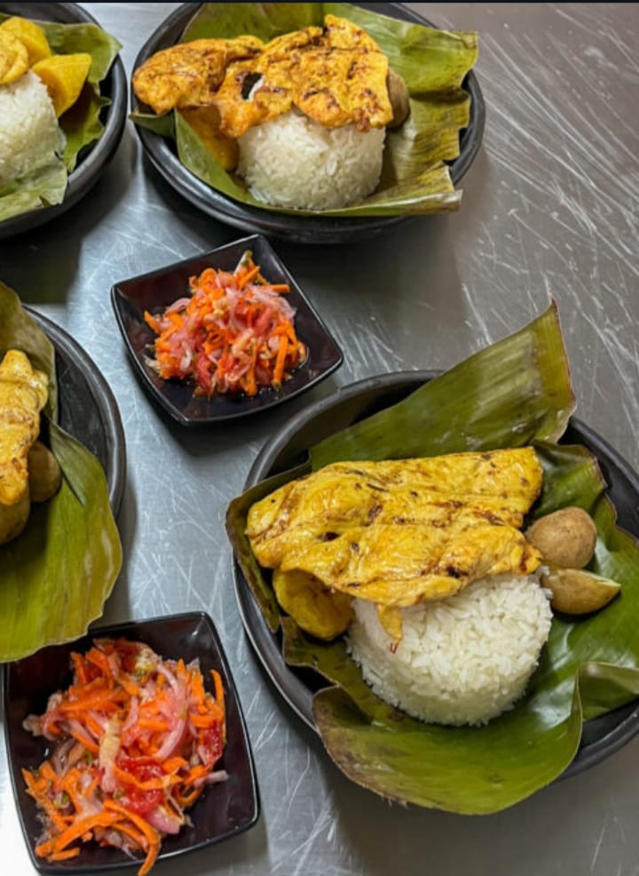 ( pierna pernil, carne de cerdo, 2 huevos cocinados, yuca, papa y maduro )