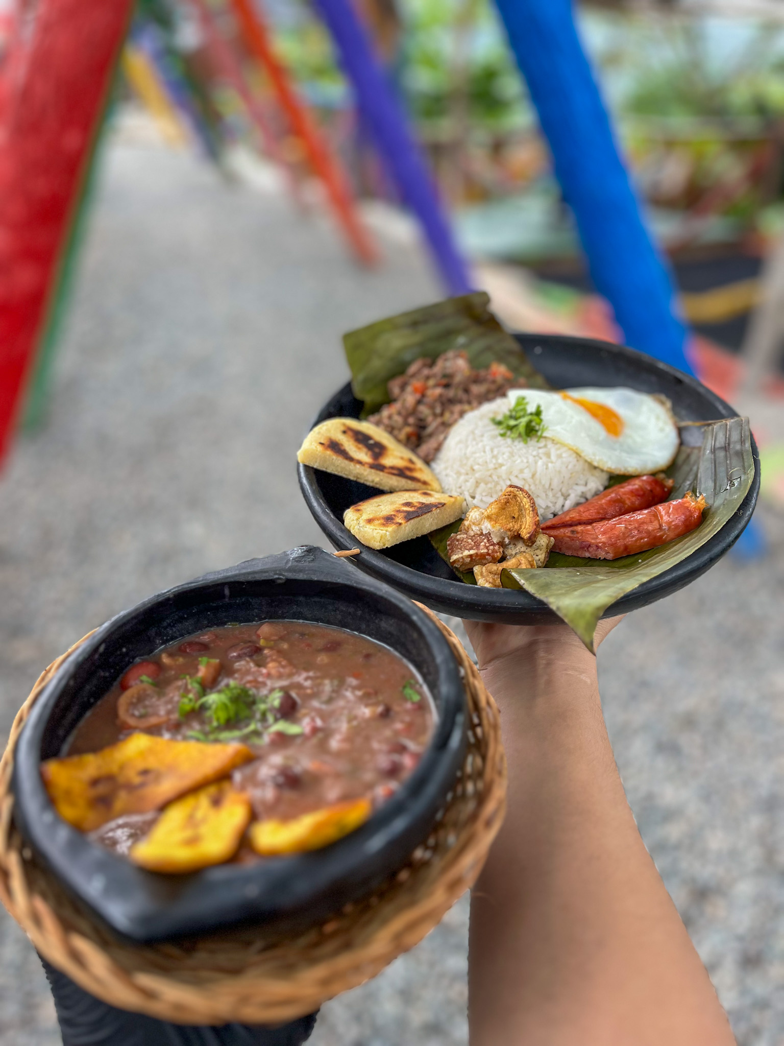 ( arroz salteado con verduras y carne de cerdo. Acompañada de chicharrón, chorizo artesanal, aguacate, chip de plátano y rocío de cilantro )