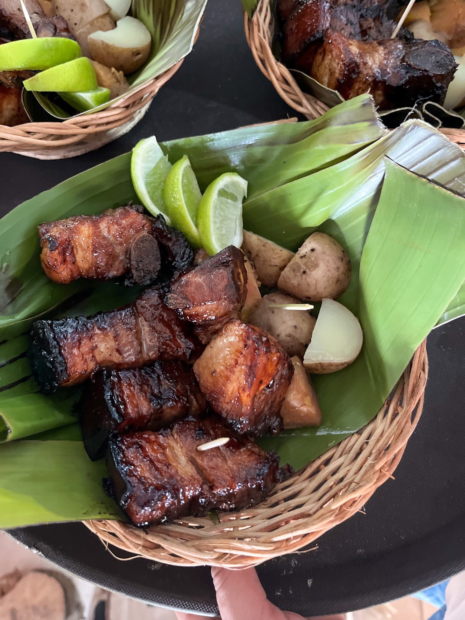( costillas bañanas en salsa de naranja , papa salada )
